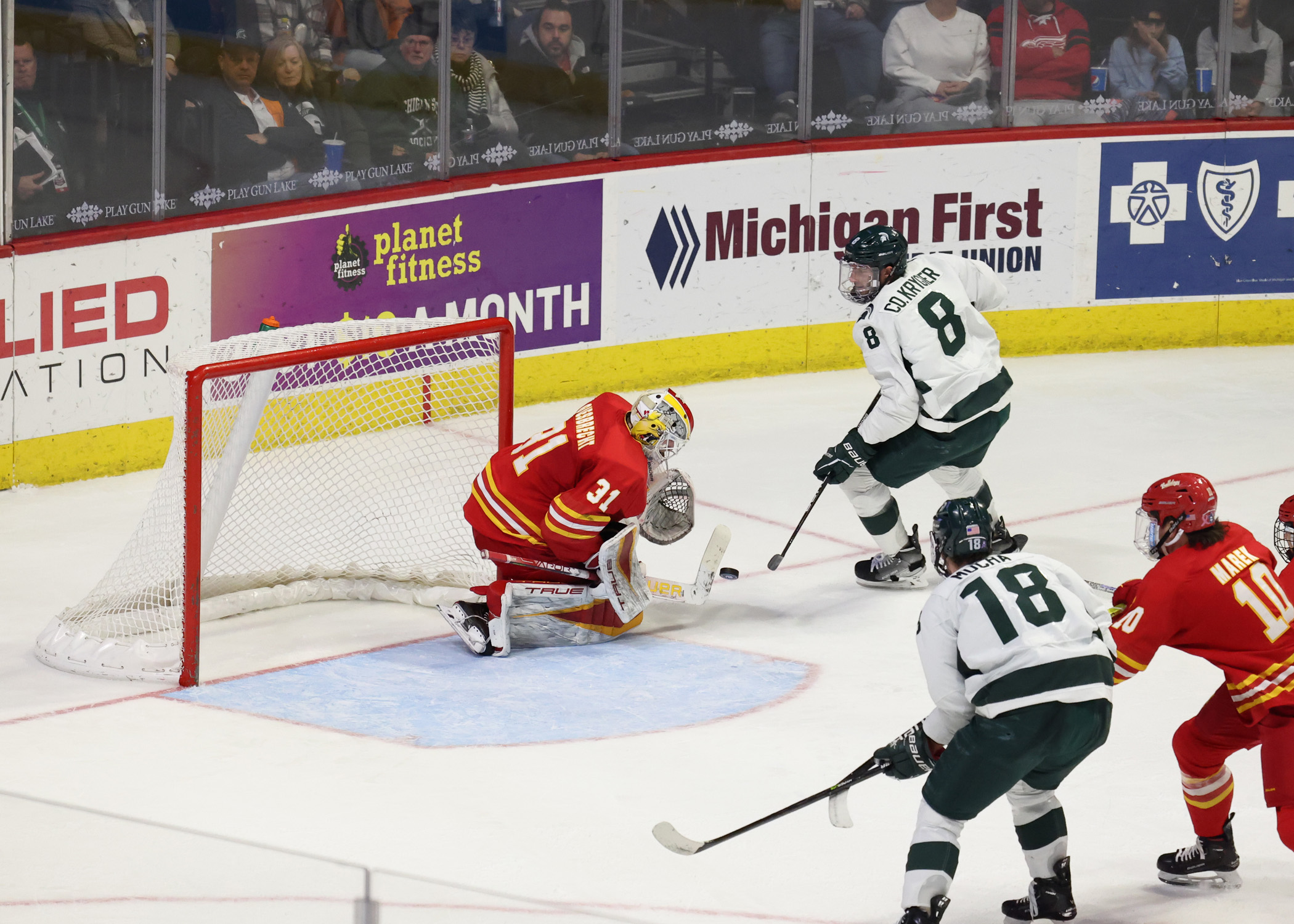 In the game against Michigan State, the Bulldogs scored three goals in the first period. Early in the period, freshman forward Tyler Schleppe capitalized on a powerplay opportunity and put the Bulldogs in front. Within the last minute of play, freshman forward Connor McGrath skated in on a breakaway and scored, bringing the lead to 2-0. Then, junior forward Mitch Deelstra scored in the closing seconds and brought the Bulldogs up to a 3-0 lead.