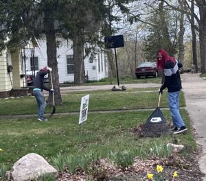 Jared Wallace (left) and Samara Tyus (right) tidy-up Big Rapids residents’ Photo courtesy of Jennifer O’Connor