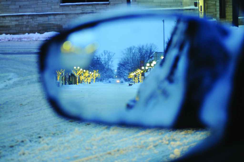 A snowy car mirror on a drive in downtown Big Rapids. Photo credit: Nate Mathewson, News Reporter