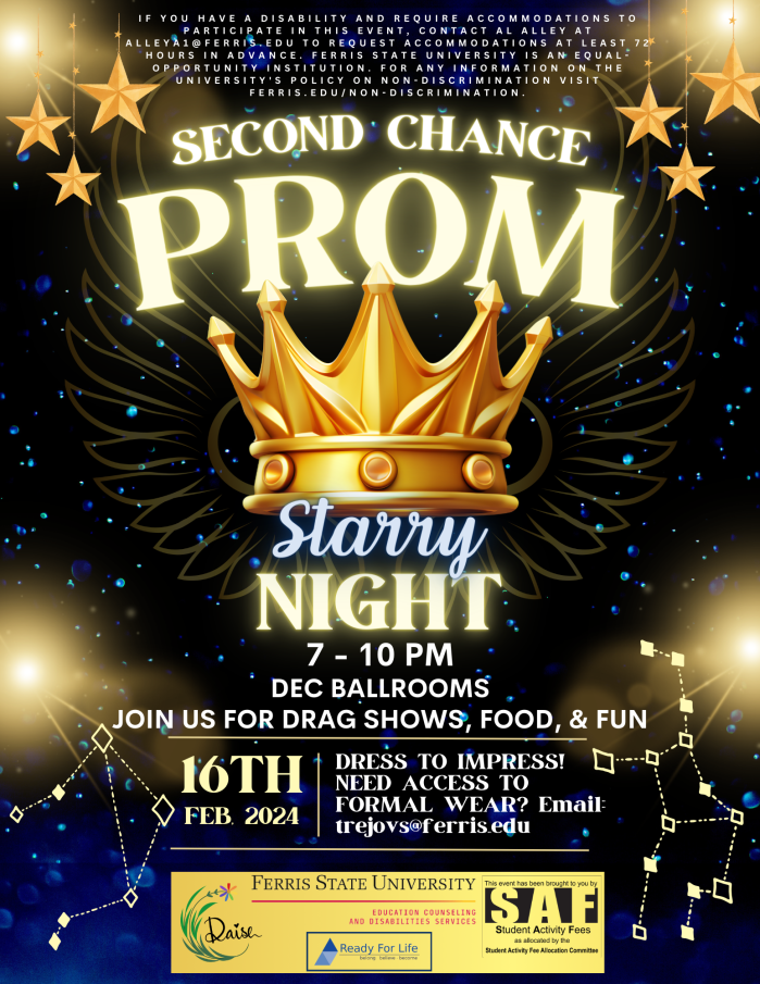 Ferris will be holding its first-ever Second Chance Prom on Friday, Feb. 16, from 7 p.m. to 10 p.m. in the David L. Eisler Center Ballrooms.