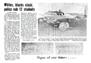 Snead maintains that the race relations and law enforcement in the area were rarely violent in his experience. In May 1969, however, 14 students were injured and 12 were arrested for “unlawful assembly” on the west side of campus.