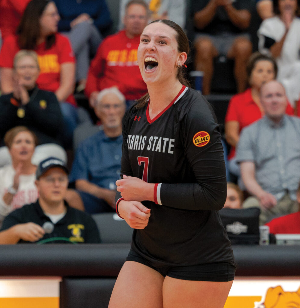 Emma Bleecher screaming after getting a kill against Northern Michigan. Photo by: Abraham Kraus| Multimedia Editor