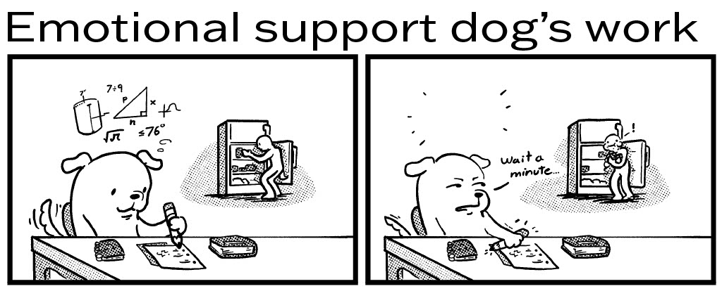 Emotional support dog’s work Posted by Blake Flanery on October 8, 2025 in Cartoons, Opinions. Comic by: Blake Flanery | Cartoonist