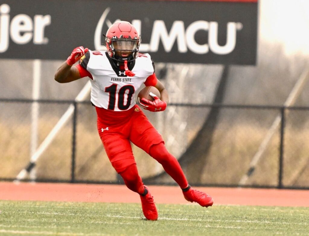 Slot receiver Taarik Brett carries the ball against Davenport. Photo courtesy of Ferris Athletics