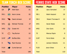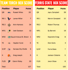 The running backs dominated for Team Torch, handing us a 175-89 victory over the Ferris football team in this week’s fantasy match up. The Bulldogs held off a late comeback […]